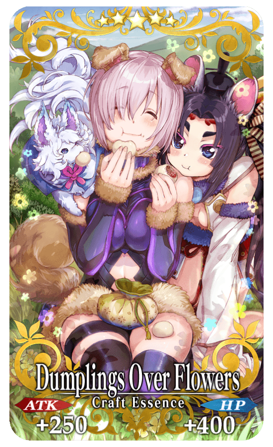 ★★★★★SSR Dumplings Over Flowers ATK 250 (MAX: 1000) HP 400 (MAX: 1600) Skill Increase Quick Card effectiveness by 15% & NP Strength by 15% for yourself |