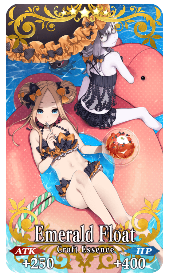 ★★★★★SSR Emerald Float ATK 250 (MAX: 1000) HP 400 (MAX: 1600) Skill Increase Arts Card effectiveness by 15% & NP Strength by 15% for yourself |