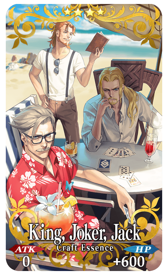 ★★★★SR King, Joker, Jack ATK 0 HP 600 (MAX: 2250) Skill Increase Buster Card effectiveness by 8% & NP Strength by 8% & DEF by 3% for yourself |