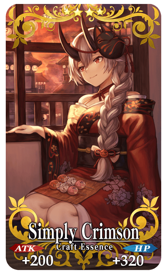 ★★★★SR Simply Crimson ATK 200 (MAX: 750) HP 320 (MAX:1200) Skill Increase Buster Card effectiveness by 8% & Critical Strength by 8% & NP Gain by 8% for yourself |