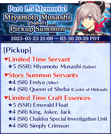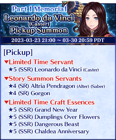 Six Servants, including Limited Time Servants "★5 (SSR) Leonardo da Vinci (Caster)" and "★5 (SSR) Miyamoto Musashi (Saber)", as well as eight Limited Time Craft Essences will be available for Pickup in two Pickup Lineups!