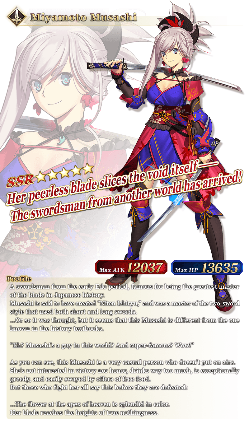- ★5 (SSR) Miyamoto Musashi (Saber)