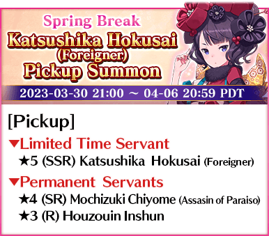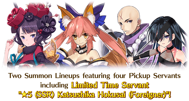 Two different Pickup Summons, featuring four Servants including Limited Time Servant "★5 (SSR) Katsushika Hokusai (Foreigner)", will be available!