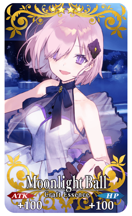★★★★SR Moonlight Ball ATK 100 (MAX: 100) HP 100 (MAX: 100) Skill When a quest is completed, increase the amount of Mystic Code EXP gained by 50 |