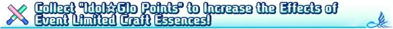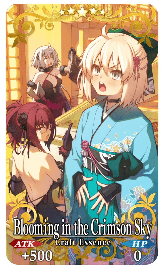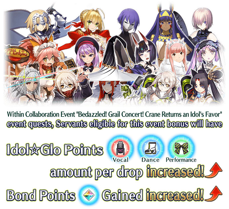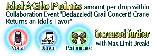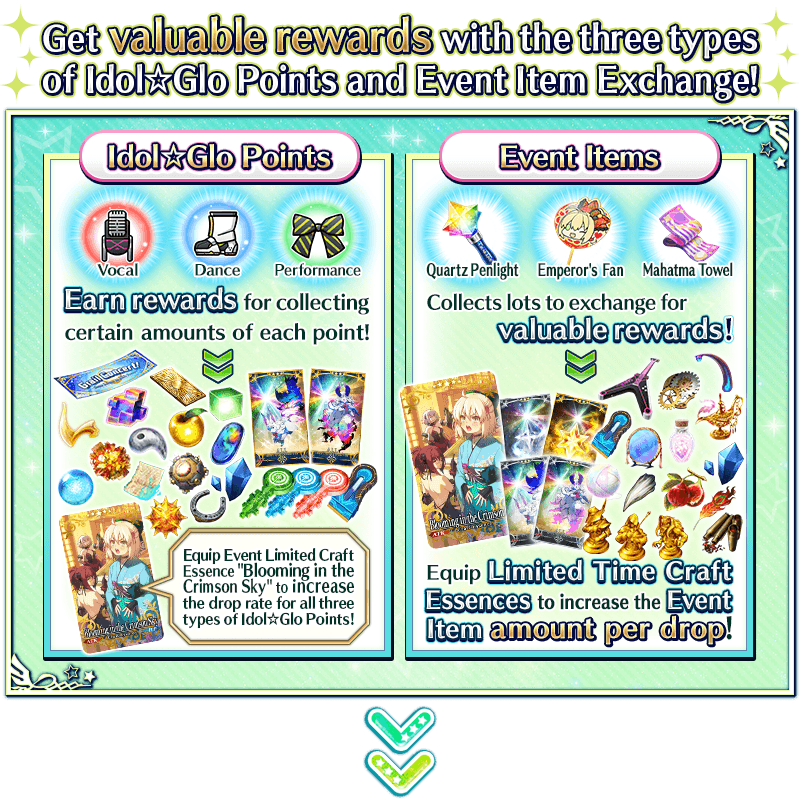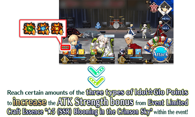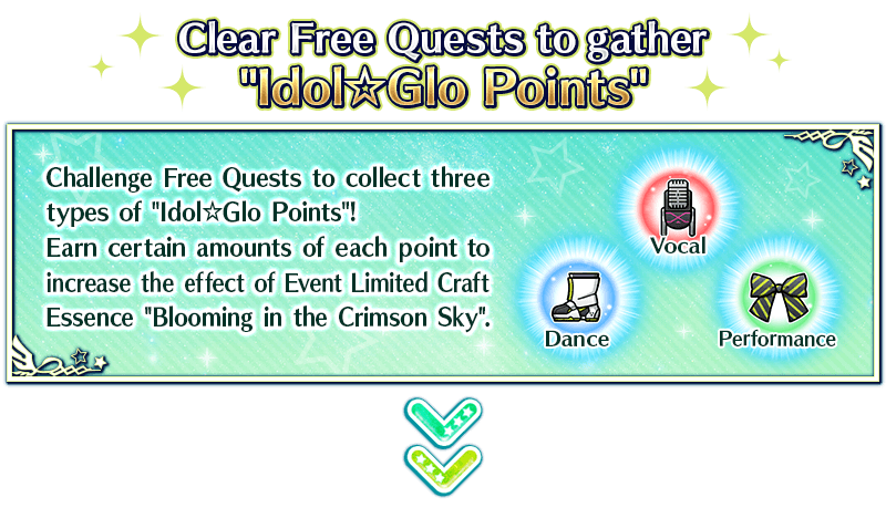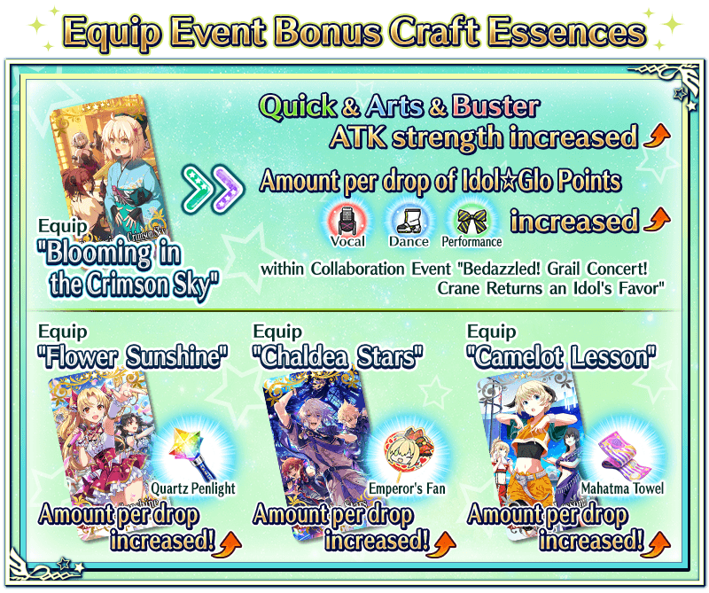 Equip Event Limited Craft Essence "★5 (SSR) Blooming in the Crimson Sky", obtainable from Event Point rewards and Event Item Exchange to receive an amount per drop bonus of Idol☆Glo Point (Vocal), Idol☆Glo Point (Dance), and Idol☆Glo Point (Performance) within Collaboration Event "Bedazzled! Grail Concert! Crane Returns an Idol's Favor"!