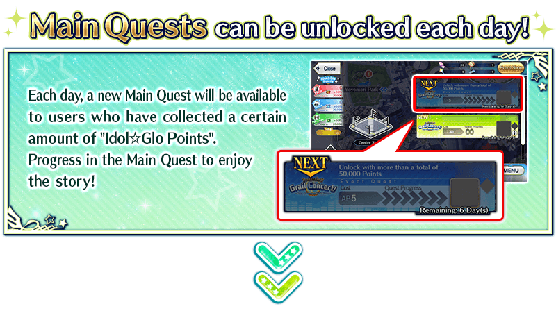Progress in the main quest and collect "Idol☆Glo Points" by completing "Concert Quests" to receive valuable rewards, such as Event Items.