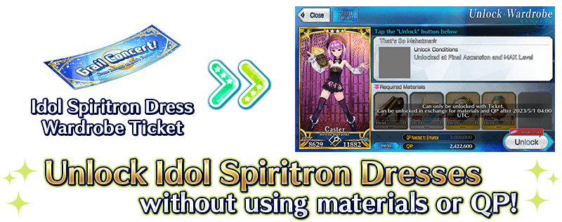 * The Idol Spiritron Dress Wardrobe Tickets required to unlock each Idol Spiritron Dress will only be obtainable during the event period of Collaboration Event "Bedazzled! Grail Concert! Crane Returns an Idol's Favor". * After the event has finished (2023-04-30 21:00 PDT (GMT -7), you can choose to use either Idol Spiritron Dress Wardrobe Tickets or other materials and QP, as with other Spiritron Dresses, to unlock Idol Spiritron Dresses.