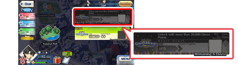 * Quest clear rewards, dropped items, Master EXP, Mystic Code EXP, and Bond Points will only be rewarded for the first clear. * The "Challenge Quest" for this event is a "Concert Battle".