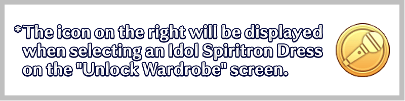 The Idol Spiritron Dresses featured in the Main Story of the event can be unlocked using "Idol Spiritron Dress Wardrobe Tickets", which can be acquired as rewards for collecting Event Points only during the Event Period. Idol Spiritron Dresses that are unlocked using "Idol Spiritron Dress Wardrobe Tickets" will not require any additional materials or QP.