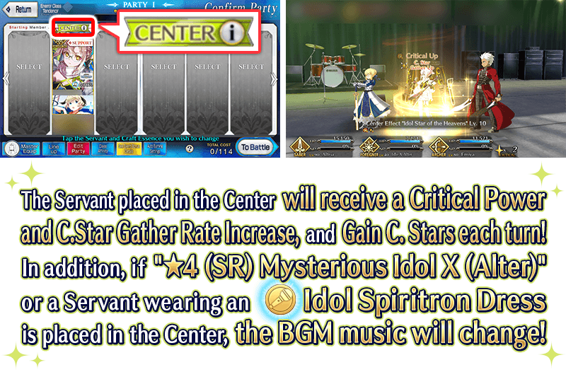 Unlike normal battles, the Servant placed in the center of your formation will receive special "Center Effects". When "★4 (SR) Mysterious Idol X (Alter)" or a Servant equipped with an Idol Spiritron Dress is placed in the center, the background music will change to that Servant's song!