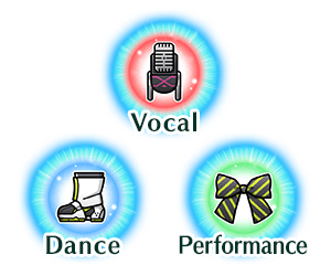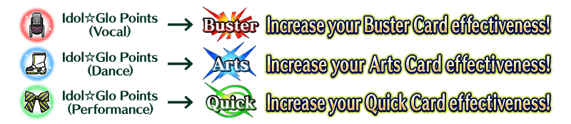 You can collect "Idol☆Glo Points (Vocal)", "Idol☆Glo Points (Dance)", and "Idol☆Glo Points (Performance)" by clearing Free Quests.