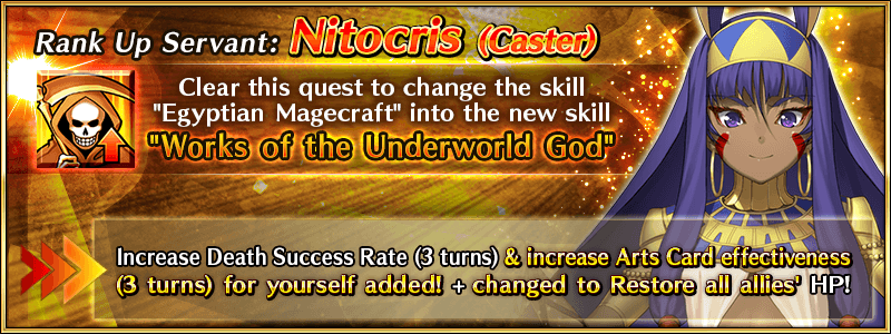 "Servant Rank Up Quests" to strengthen "★5 (SSR) Queen Medb (Rider)", "★5 (SSR) Mysterious Heroine X (Alter)", "★4 (SR) Nitocris (Caster)", and "★3 (R) Hassan of the Serenity" will be permanently added to Chaldea Gate on the following date.