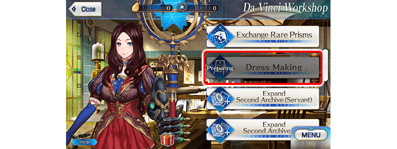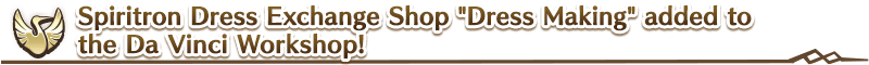 "Dress Making" is a special shop that includes all Spiritron Dress Wardrobe Keys previously available in "Exchange Mana Prisms" and "Exchange Rare Prisms" in the Da Vinci Workshop.
