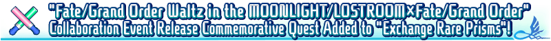 * "Fate/Grand Order Waltz in the MOONLIGHT/LOSTROOM×Fate/Grand Order" Collaboration Event Commemorative Quest will be permanently added to "Exchange Rare Prisms". There will be no time limit on exchange. * "Fate/Grand Order Waltz in the MOONLIGHT/LOSTROOM×Fate/Grand Order" Collaboration Event Commemorative Quest can only be played once. * After you have played "Fate/Grand Order Waltz in the MOONLIGHT/LOSTROOM×Fate/Grand Order" Collaboration Event Commemorative Quest, it will be added to "Event Quest Record" in "Material" in My Room. * If you have already played the quest, it will be added to "Event Quest Record" in "Material" in My Room on 2023-04-30 21:00 PDT (GMT -7). * If you have previously cleared "Fate/Grand Order Waltz in the MOONLIGHT/LOSTROOM×Fate/Grand Order" Collaboration Event Commemorative Quest, it will not be available for exchange.
