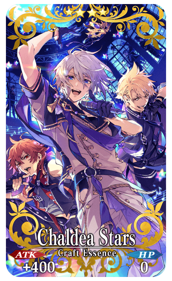 ★★★★SR Chaldea Stars ATK 400 (MAX: 1500) HP 0 Skill Gain 10 C. Stars when entering the field for the first time (1 time) & increase Arts Card effectiveness by 3% & increase NP Gain by 5% for yourself + Increase Emperor's Fan amount per drop by 1 [Event Only]