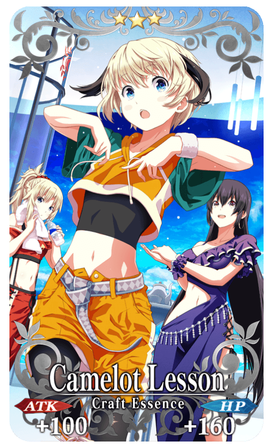 ★★★R Camelot Lesson ATK 100 (MAX: 500) HP 160 (MAX: 800) Skill Apply Damage Cut 100 & increase Buster Card effectiveness by 3% for yourself + Increase Mahatma Towel amount per drop by 1 [Event Only]