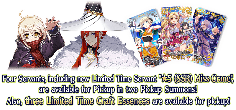 Four Servants from the Fate/Grand Order Waltz in the MOONLIGHT/LOSTROOM×Fate/Grand Order Collaboration Event "Bedazzled! Grail Concert! Crane Returns an Idol's Favor", including new Limited Time Servant "★5 (SSR) Miss Crane", as well as three Limited Time Craft Essences will be featured as Pickup Servants and Pickup Craft Essences in two Pickup Summons!