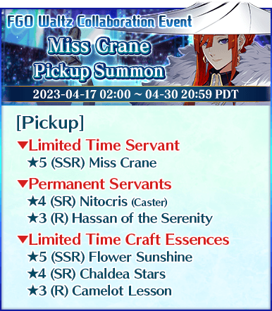 The following will also be ongoing for a limited time: - Fate/Grand Order Waltz in the MOONLIGHT/LOSTROOM×Fate/Grand Order Collaboration Event "Bedazzled! Grail Concert! Crane Returns an Idol's Favor" - FGO Waltz Collaboration Event Pickup 2 Summon" - Fate/Grand Order Waltz in the MOONLIGHT/LOSTROOM×Fate/Grand Order Collaboration Event Pre-Release Campaign - FGO Waltz Collaboration Event Pre-Release Pickup Summon For more information, please see the article linked below.