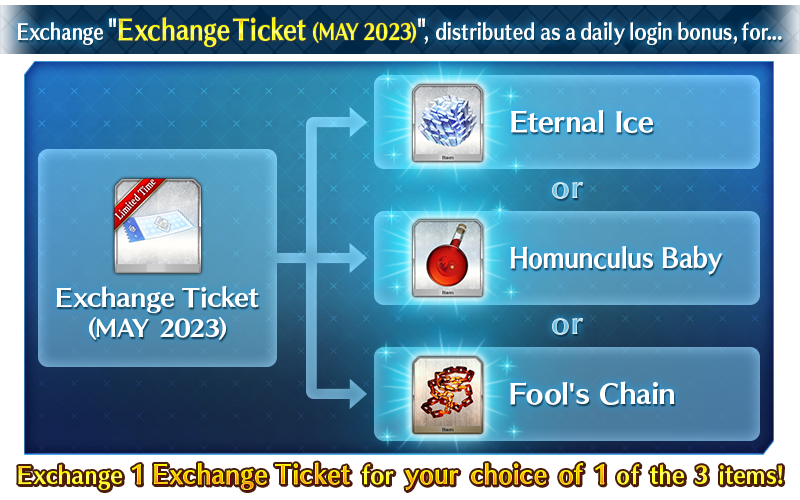 The "Exchange Ticket (MAY 2023)" distributed as a daily login bonus will be exchangeable for the following items.