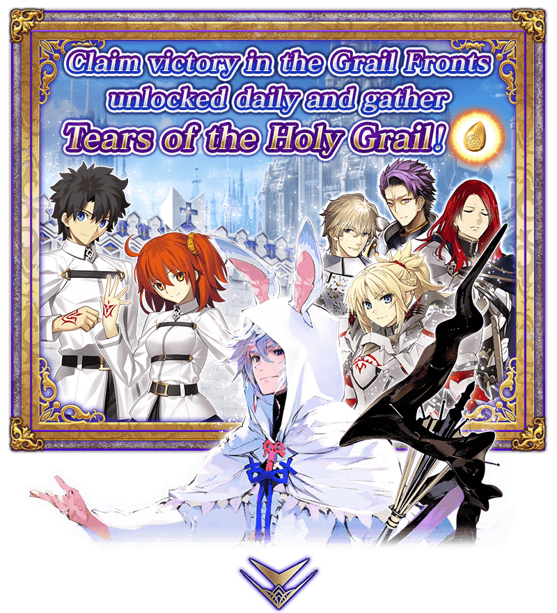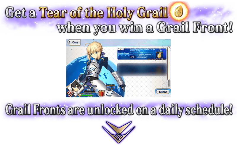 In each Grail Front, Masters and Servants divided into enemies and allies will battle multiple times on a special battlefield. Win a Grail Front to earn one Tear of the Holy Grail.