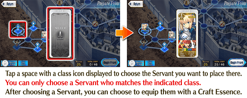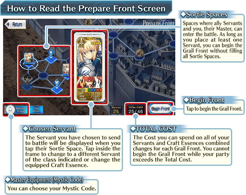 The first thing you'll do in each Grail Front is choose your Mystic Code and the Servants you want to send into battle on the “Prepare Front” screen. Each Grail Front has a predetermined "TOTAL COST". You cannot exceed the "TOTAL COST" when setting your Servants and Craft Essences. However, as long as you set at least once Servant to send into battle, you don't have to set Servants in every space available.