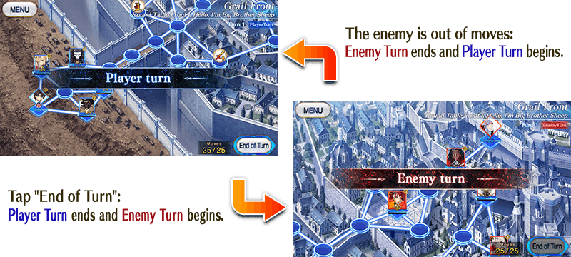 A set number of moves is granted at the beginning of each Player Turn and Enemy Turn. Moving the Master or Servants or attacking will expend moves. When you are out of moves or tap the "End of Turn" button on the bottom right side of the screen, the turn will end.