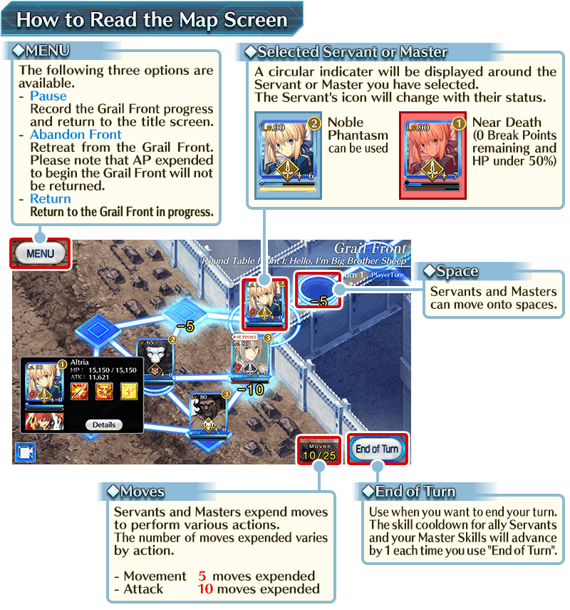 You can check your remaining moves and Servants’ statuses on the Grail Front map screen. Tap an ally Servant's icon to check their status screen.