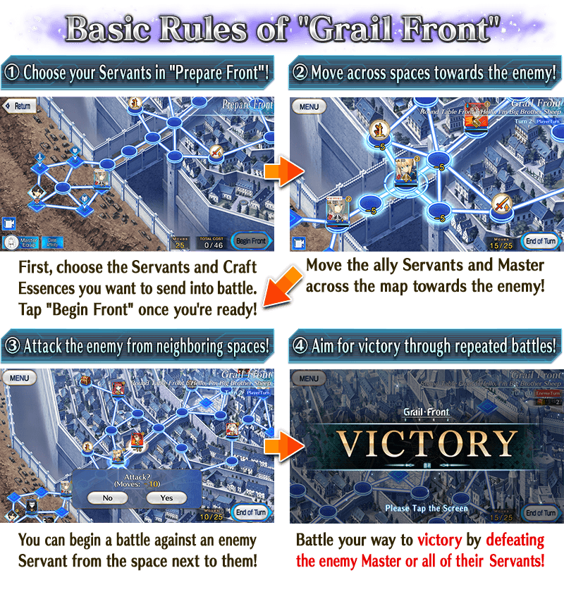 Alternate turns and defeat the enemy Master or defeat all enemy Servants to win the Grail Front.