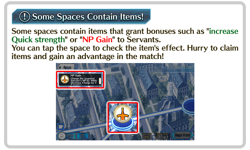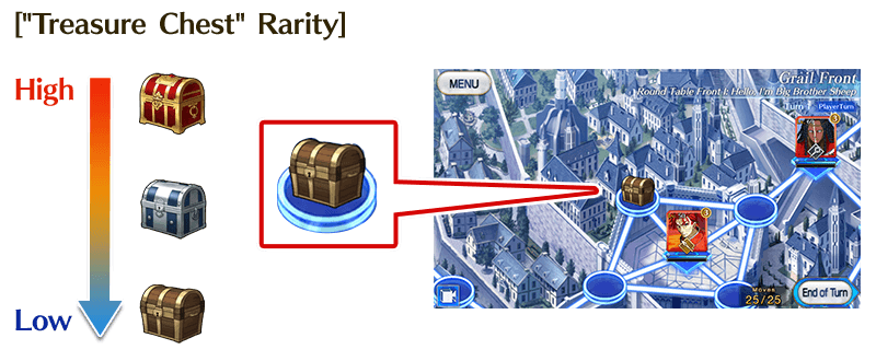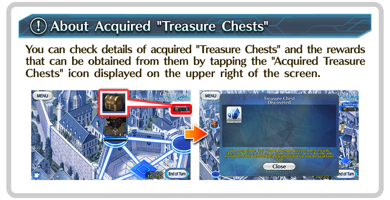 * "Treasure Chest" rewards can only be received once. If you complete a quest after acquiring a "Treasure Chest" and retry the same quest, the "Treasure Chest" will not appear again. * If you complete a quest without acquiring a "Treasure Chest" and retry the same quest, the "Treasure Chest" will appear and you will be able to acquire it. * If you select "Abandon Front" after acquiring a "Treasure Chest", you can reacquire the "Treasure Chest" by retrying the quest. * Even if an enemy Servant or enemy Master stops on a "Treasure Chest" space, the "Treasure Chest" will not be lost and you will still be able to acquire it.
