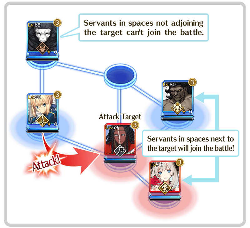 In addition, if there are any Servants in spaces next to the target of an attack, they will also join the battle.