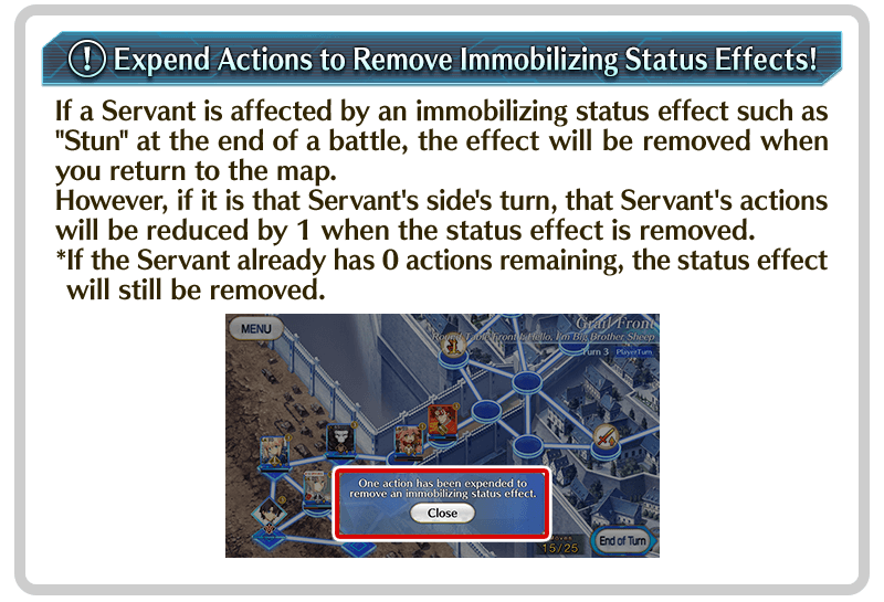 A Servant whose HP is reduced to 0 will retreat from that battle, but upon returning to the map a Break Point will be expended and their HP will be fully recovered. If a Servant's HP is reduced to 0 when they have no Break Points remaining, they will be removed from the map.