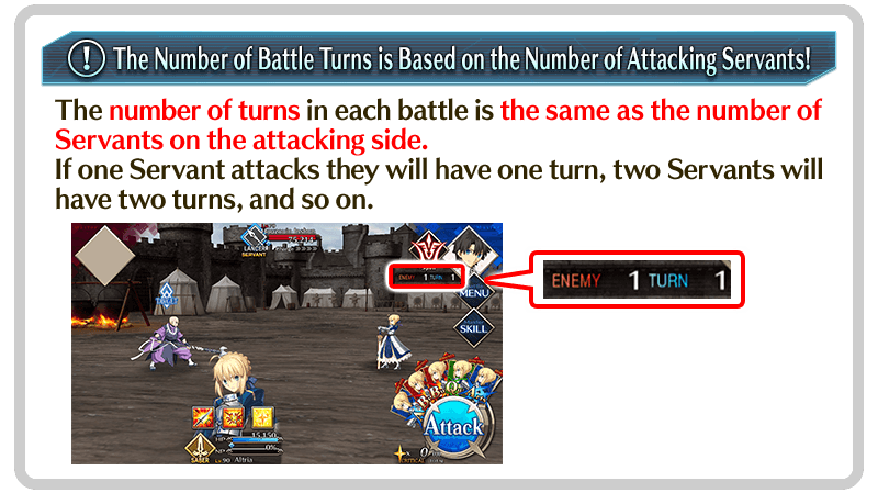 A Servant can expend 10 moves to attack an enemy Servant in a space next to them, upon which a battle will begin. When a number of turns equal to the number of attacking Servants has passed, or one side's Servants have all had their HP reduced to 0, you will return to the map.
