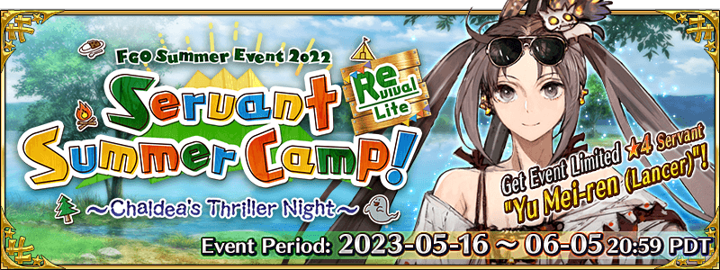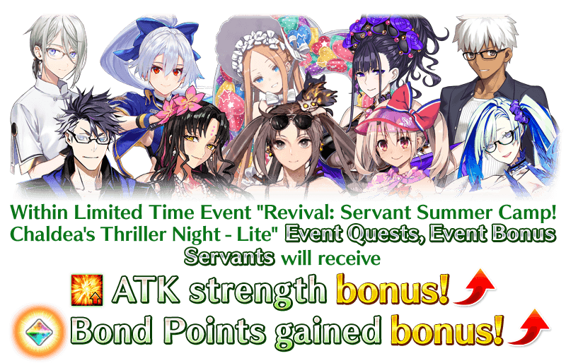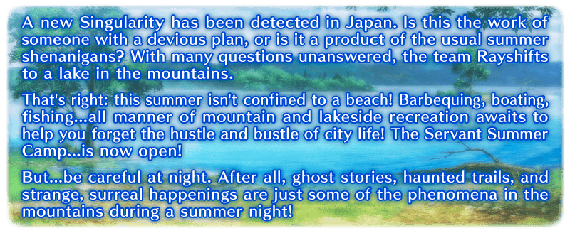 * In-game graphics may vary from the images used within this article. *This event is a "Revival Lite" version of the 2022 Limited Time Event "Servant Summer Camp! Chaldea's Thriller Night". Certain elements have been adjusted for a more enjoyable experience. * Certain quests will be unlocked at a later date.