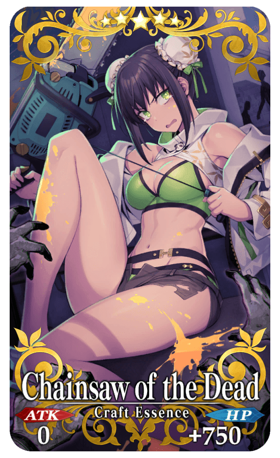 ★★★★★SSR Chainsaw of the Dead ATK 0 HP 750 (MAX: 3000) Skill Increase Arts Card effectiveness by 8% & Critical attack resistance by 5% & begin battle with NP charged at 30% for yourself + Increase appearance rate of Rare enemies by 15% in "Revival: Servant Summer Camp! - Chaldea's Thriller Night - Lite" [Event Only]