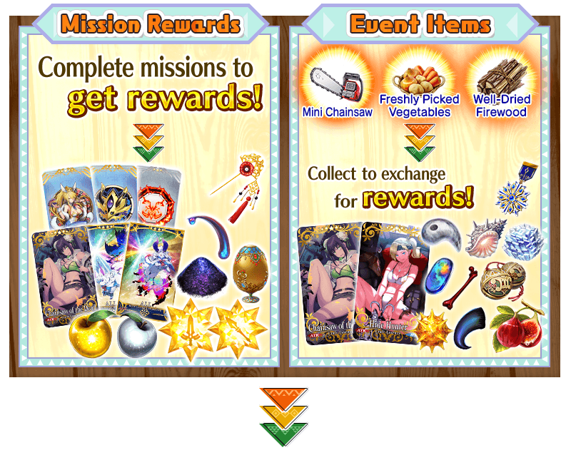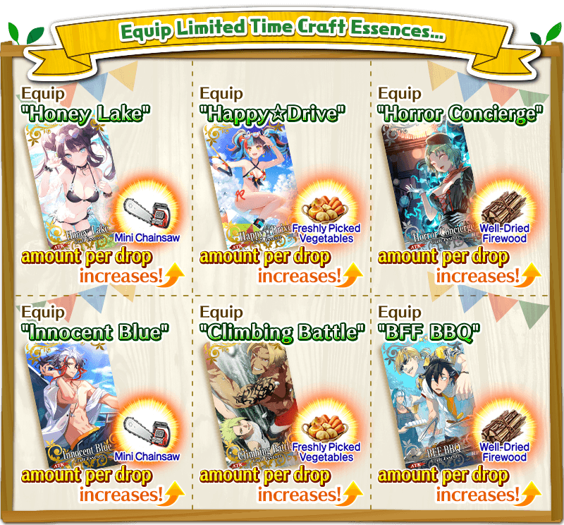 Servants equipped with the Limited Time Craft Essences "★5 (SSR) Honey Lake", "★5 (SSR) Innocent Blue", "★4 (SR) Happy☆Drive", "★4 (SR) Climbing Battle", "★3 (R) Horror Concierge", and "★3 (R) BFF BBQ", available through the ongoing Pickup Summons, will receive a bonus to the amount per drop of event items "Mini Chainsaw", "Freshly Picked Vegetables", and "Well-Dried Firewood".