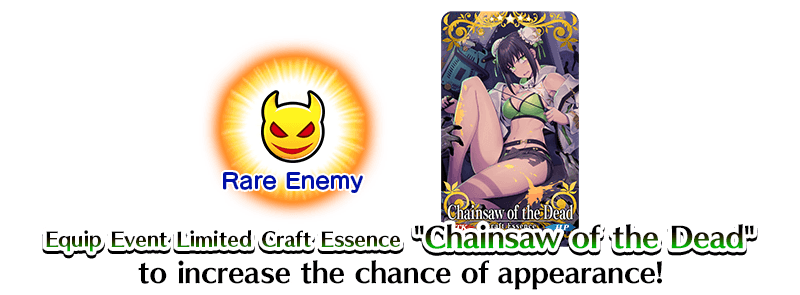 Equip the Event Limited Craft Essence "★5 (SSR) Chainsaw of the Dead", available as Event Mission Rewards and through Event Item Exchange, to increase the chance of Rare Enemy appearance by 15%.