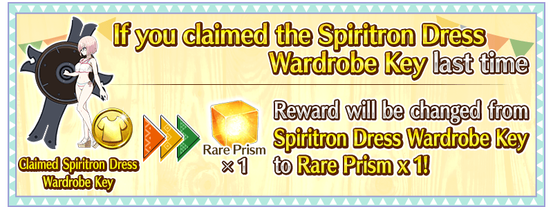 In addition, if you earned the Spiritron Dress Wardrobe Key through 2022's Limited Time Event "Servant Summer Camp! Chaldea's Thriller Night", one Rare Prism will be available as Quest Rewards in place of the Spiritron Dress Wardrobe Key.