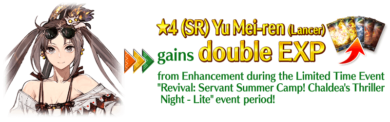 For the duration of the event period, "★4 (SR) Yu Mei-ren (Lancer)" will receive double EXP when performing Enhancement.