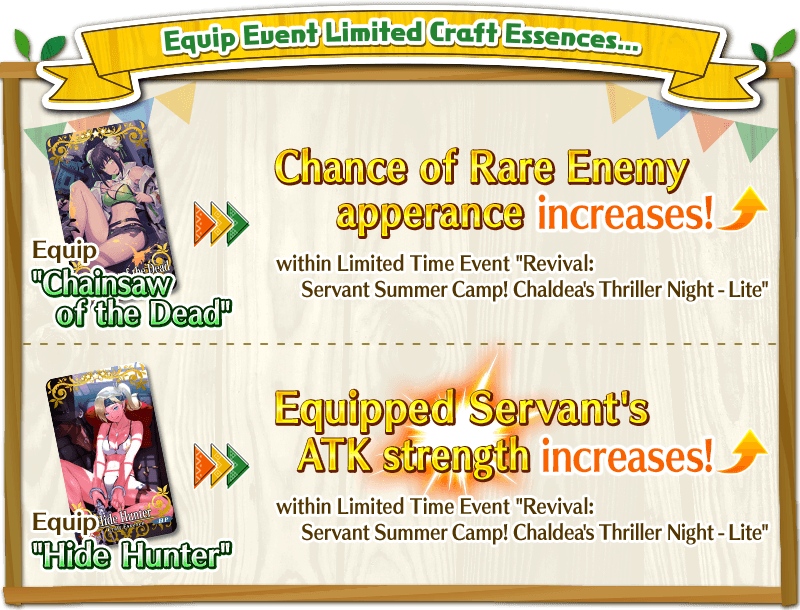Plus, equip the Event Limited Craft Essence "★5 (SSR) Hide Hunter", available through Event Item Exchange, to gain an ATK bonus for the equipped Servant during "Revival: Servant Summer Camp! Chaldea's Thriller Night - Lite" Event Quests.