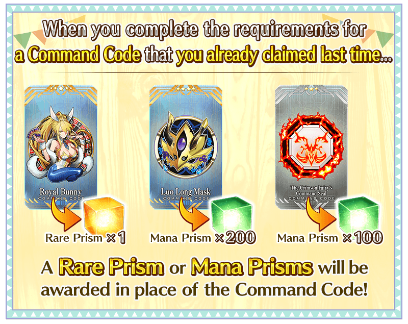 - If you already claimed a "Command Code" as a Mission Reward in the original event, the equivalent reward for completing that specific mission will be a Rare Prism or Mana Prisms.
