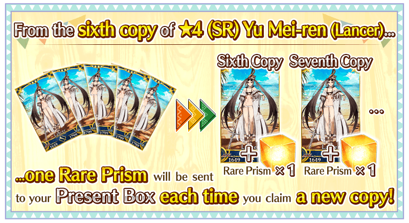 Once you have acquired a total of six copies of "★4 (SR) Yu Mei-ren (Lancer)", one Rare Prism will be awarded for each new copy, beginning with the sixth.