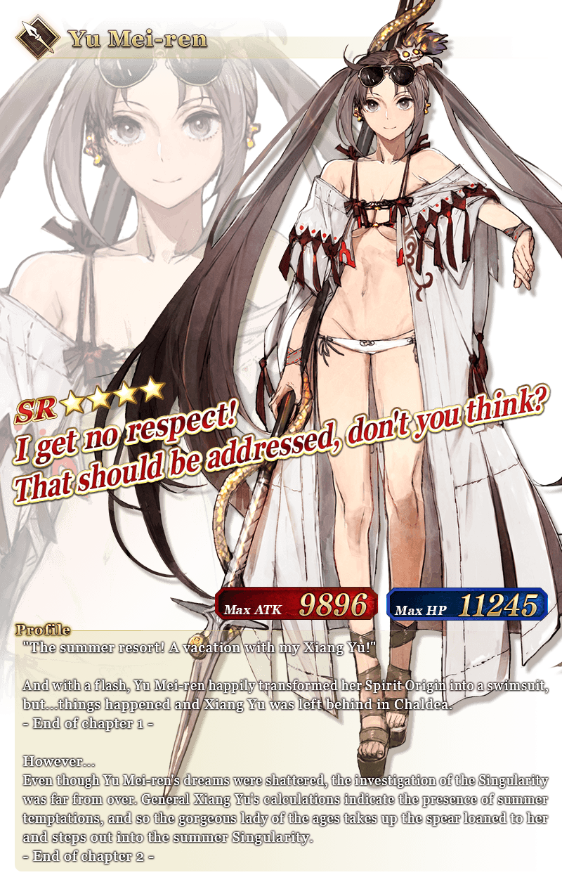 * The battle sprite for "★4 (SR) Yu Mei-ren (Lancer)" will not change with Ascension Stage.