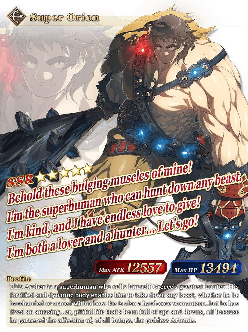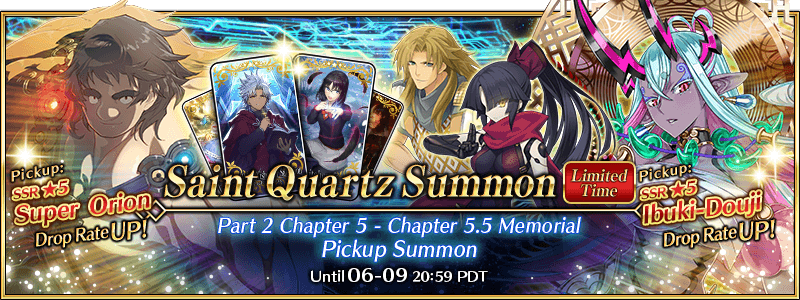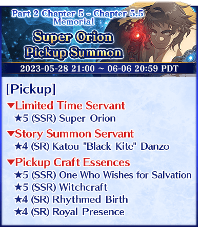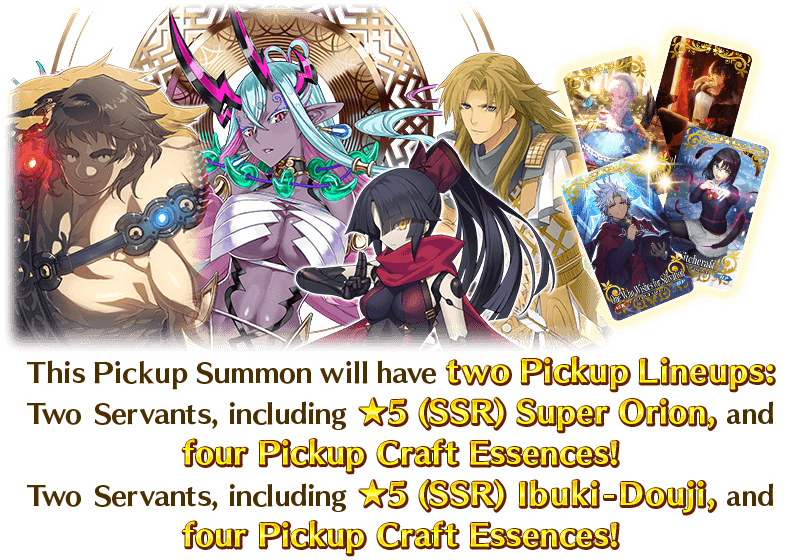Four Servants, including Limited Time Servants “★5 (SSR) Super Orion” and “★5 (SSR) Ibuki-Douji”, and four Craft Essences will be available for pickup in two Pickup Summons!