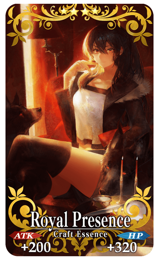 ★★★★SR Royal Presence ATK 200 (MAX: 750) HP 320 (MAX: 1200) Skill Increase Quick Card effectiveness by 8% & increase NP Gain by 15% for yourself |