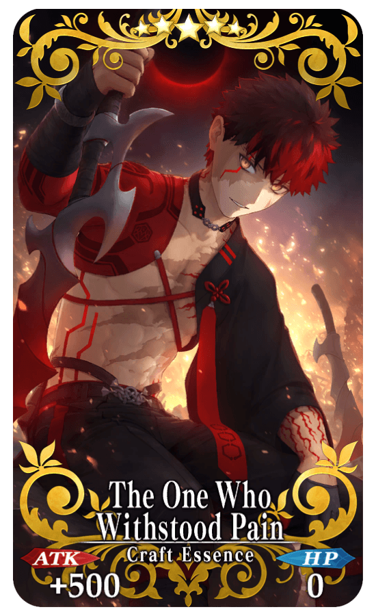 ★★★★★SSR The One Who Withstood Pain ATK 500 (MAX: 2000) HP 0 Skill Increase Arts Card effectiveness by 15% & increase NP Charge by 2 levels when using NP (1 time) for yourself |