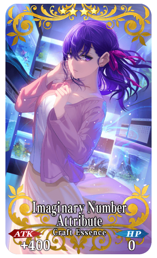 ★★★★SR Imaginary Number Attribute ATK 400 (MAX: 1500) HP 0 Skill Increase Quick Card effectiveness by 8% & begin battle with NP charged at 30% for yourself |