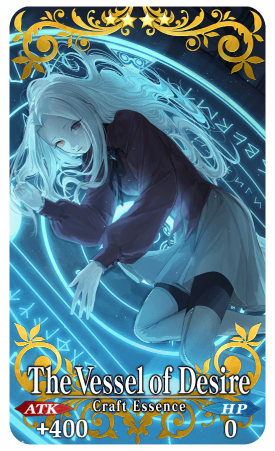 ★★★★SR The Vessel of Desire ATK 400 (MAX: 1500) HP 0 Skill Increase NP Strength by 10% & begin battle with NP charged at 30% for yourself |