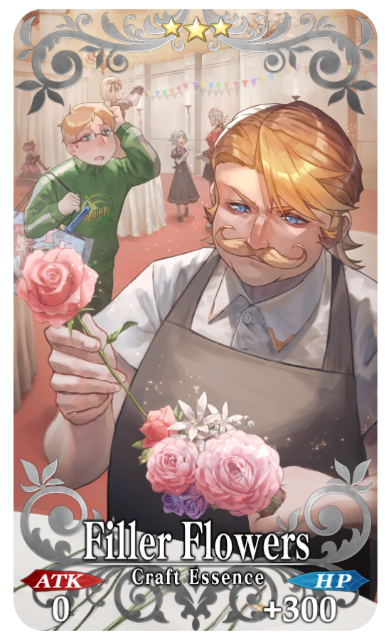 ▼Limited Time Craft Essences - ★5 (SSR) Celebrate Memories - ★4 (SR) Brainstorming - ★3 (R) Filler Flowers