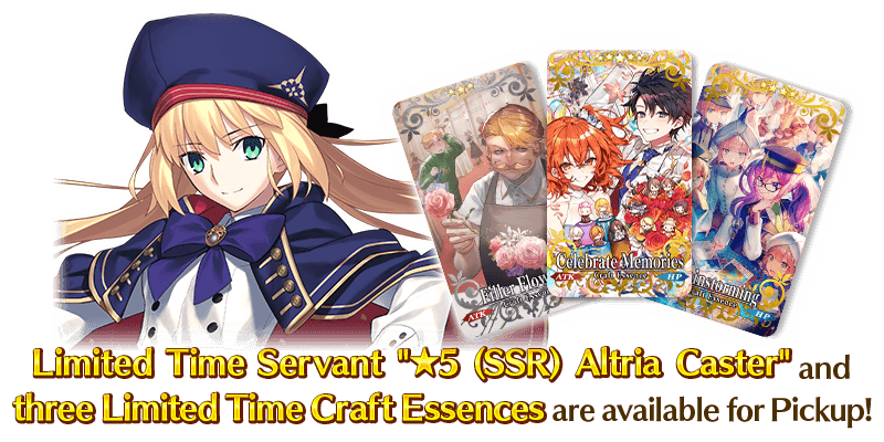 Limited Time Servant "★5 (SSR) Altria Caster" from Part 2 Chapter 6 "Lostbelt No. 6 Fae Round Table Domain, Avalon le Fae - The Moment a Planet Is Born" (Act I) and three Limited Time Craft Essences from 2022's "5th Anniversary Pickup Summon (Daily)" are available for pickup!