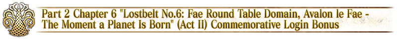 We're holding a special login bonus to celebrate the release of Part 2 Chapter 6 "Lostbelt No. 6 Fae Round Table Domain, Avalon le Fae - The Moment a Planet Is Born" (Act II)!